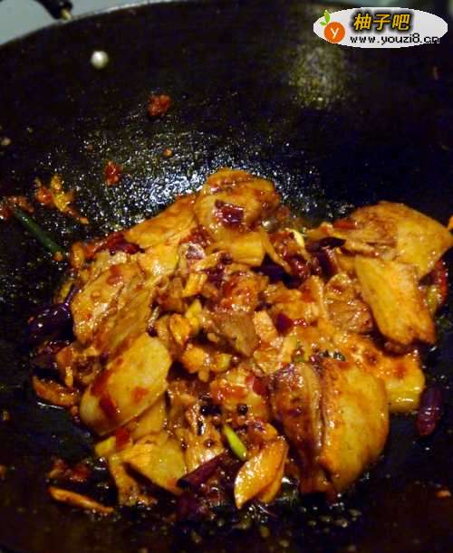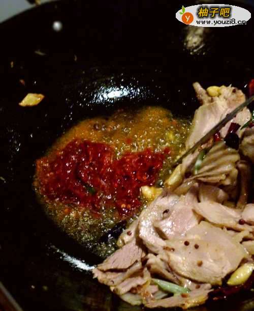 7将肉拨到锅一边,下入郫县豆瓣酱(可以先剁细)炒出红油。