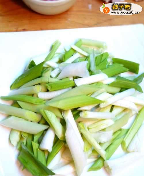 4将青蒜的白色部分先用刀拍一下,然后全部斜切成段备用。
