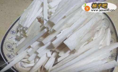 2杏鲍菇洗干净,一定要多洗两次,然后切成细条备用。