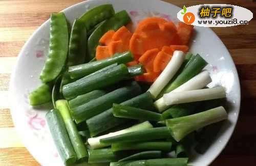 22、豆荚去筋膜,小葱切段,红萝卜切花片。