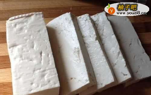 33、豆腐切约0.8-1cm厚的块状。