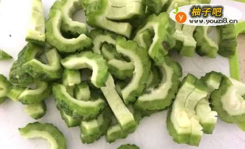 苦瓜去掉首尾部分,切开两瓣,去掉瓜子,白囊;