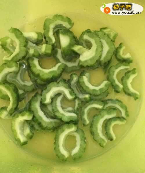 3接下来这一步非常重要,决定做出来的苦瓜苦味淡浓,用盐搓洗,浸泡20分钟后冲洗干净备用;