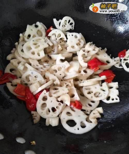 3开火,倒入红椒,藕片,加入适量的盐、白醋、糖,翻炒至成熟