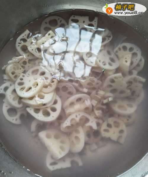 2将切好的藕片泡入冷水中,大约半个小时左右(为了去除藕片中的淀粉,炒的时候不容易粘锅)
