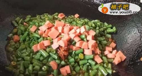 豆角切好、洗净,香肠切丁,姜切末,准备一个八角。