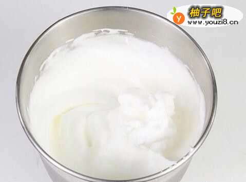 3蛋清打发,分次加入细砂糖,打至九分发即可。