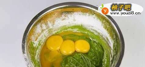 2菠菜汁中筛入低筋面粉搅拌均匀,再加入蛋黄搅拌均匀备用。