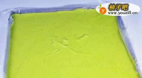 5将蛋卷糊从稍高处倒入烤盘中,并震动消泡。