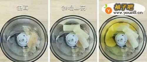 4辅食机内依次倒入银耳、铁棍山药,再磕入一个鸡蛋,搅打细腻。