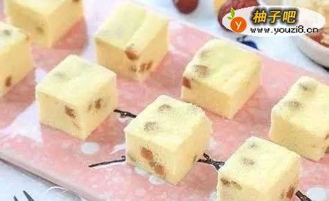 7蒸好后关火,再焖5分钟。倒扣冷却脱模,撕去硅油纸。切成小块。就可以吃了。