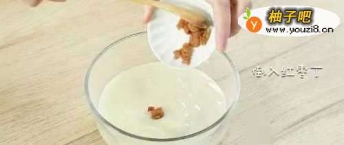 5搅打好的山药糊中倒入红枣丁,搅拌均匀。