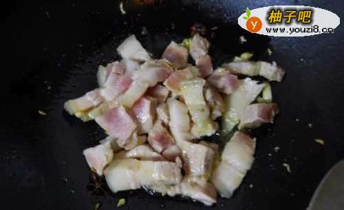 55.倒入五花肉,翻炒,放入生抽,白糖,让五花肉上色入味;