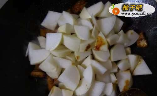 66.倒入白萝卜翻炒,加入适量清水,盖锅焖至收汁;