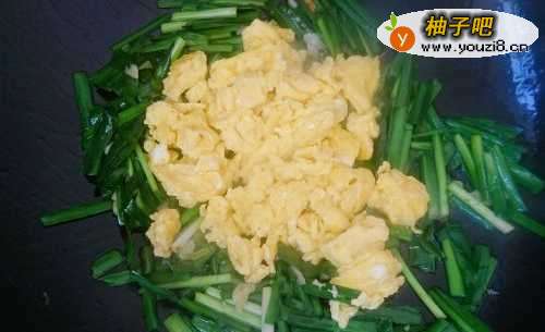 5:热锅倒油,爆香蒜末后下入韭菜段翻炒。