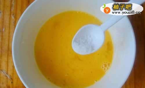 6:倒入鸡蛋,撒入食盐,翻炒均匀后即可。