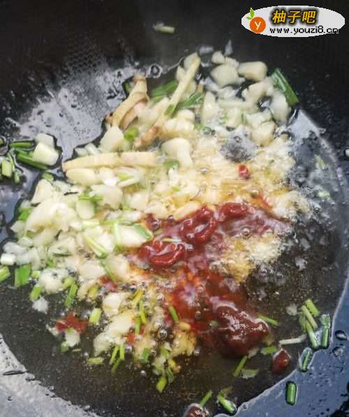 3炒锅中加油,放入葱姜蒜、少许豆瓣酱、少许黄豆酱煸香,一定要煸香,否则会有酸味影响口感。加入大料略炒两下,放入鸡腿肉翻炒,加入少许老抽上色。