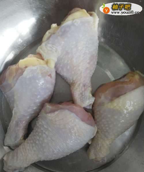 2先把鸡腿焯下水,冷水下锅,倒入少许料酒,放入一些葱段姜丝,烧开即可,捞出鸡腿肉清洗干净,这样焯水出来的鸡肉没有一点异味。