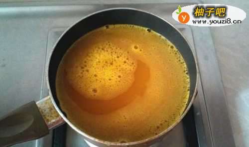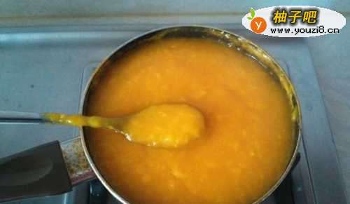5将南瓜糊倒入到不粘锅中,开小火及加入细砂糖再次煮开