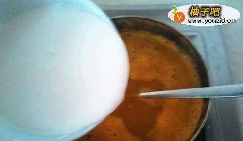 6南瓜糊略微煮开后,边搅拌边倒入糯米粉糊;必须注意一点点的将糯米粉糊倒入,这样煮出来的南瓜粥才会无颗粒顺滑