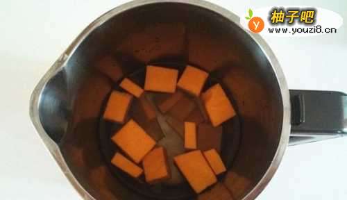 2将切好的南瓜放入豆浆机里,加入适量的水份;水份量为豆浆机平时做豆浆的量即可