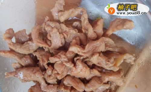 2将买到的成形肉丝提前几分钟用盐、生抽酱油、料酒腌制几分钟。将炒锅中加入适量的食用油,开火,待油微热后放入腌制好的肉丝,翻炒均匀1分钟后捞入小碗中。