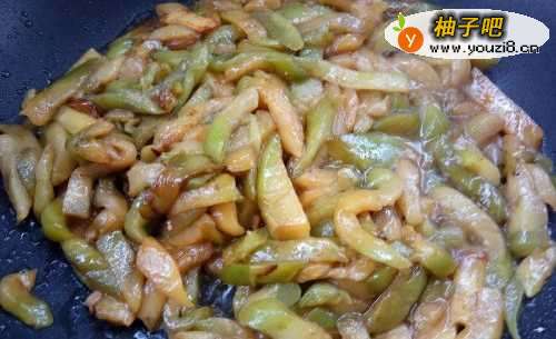 5继续翻炒均匀,然后放入适量的耗油翻炒均匀,关火。盛出上桌即可,美味香软的茄子炒肉丝家常菜就做好了。