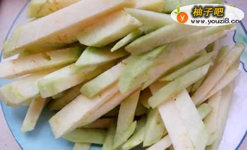 将茄子用水冲洗干净后,将茄子皮和茄子把去掉,然后切成茄子丝(约1*0.5厘米)。然后将葱姜蒜剥好洗好,分别切成段、片。