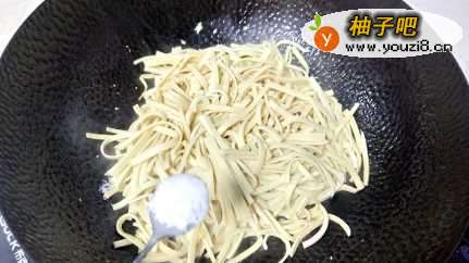 3接着,放入豆皮翻炒,放适量盐进行调味;
