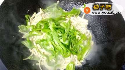 4等到豆皮熟透,我们再继续放入青椒翻炒;