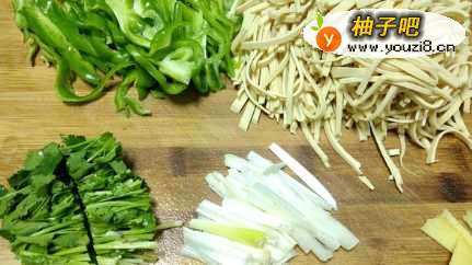 第一步,我们处理一下食材,豆皮洗净切成丝;青椒切丝;葱姜香菜分别切好;