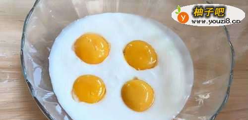 把准备好的鸡蛋分离蛋清和蛋黄,蛋清单独放在一个大碗中,蛋黄直接打入酸奶碗中。