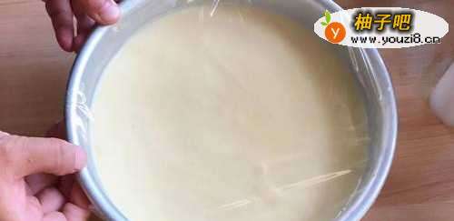 5准备一个8寸的蛋糕模,把模子底用吸油纸包好;然后把面糊倒进去,并震出里面的气泡;然后在表面盖上一层耐高温的保鲜膜,再用牙签戳小洞,方便排气。