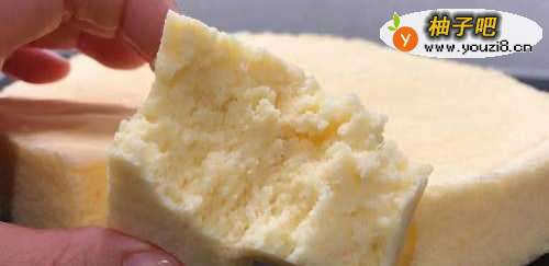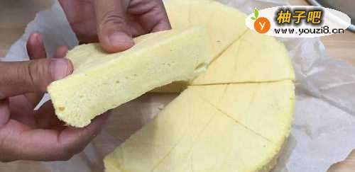 7取出蒸好的蛋糕,震出热气后撕去保鲜膜,可以用牙签戳一下蛋糕,蛋糕没有黏着牙签就是证明熟了;然后把蛋糕模竖起来自怕绵然放凉就可以轻松脱模了!撕去油纸,把蛋糕切成块状,就可以开吃了!