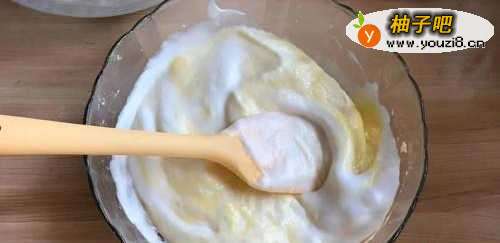 4打发好的蛋清分一半到面糊碗里,翻拌均匀后,把面糊全部倒入打发好的蛋清中,再次翻拌均匀。