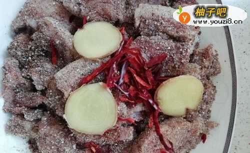 4佐料。一般做粉蒸肉是不需要再加佐料的,因为口味的原因,我加了一些辣椒丝和三个姜片,这样蒸出来的粉蒸肉稍有辣味,不至过于清淡。