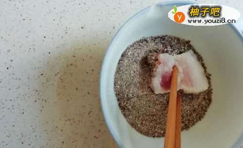 3蘸料。焯水后,将五花肉捞起来,冷水冲洗晾干,用刀将五花肉切片备用。准备一个器皿,将粉蒸料倒入其中。拿筷子捡取肉片,均匀蘸上粉料放入盘中。