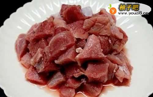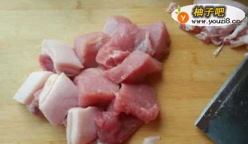 把猪肉洗净,切成小方块。笋和辣椒切成菱形块。
