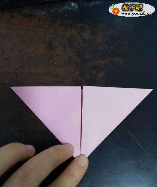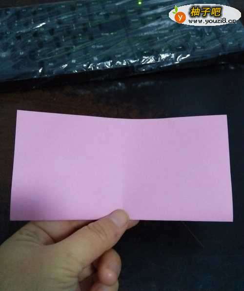 2我们把准备好的彩纸,先中线对折。