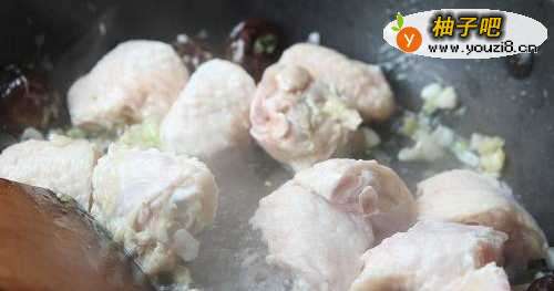 5鸡翅冲洗干净剁开成2半,香菇炒出香味后放入鸡翅翻炒到鸡翅皮肉紧缩;