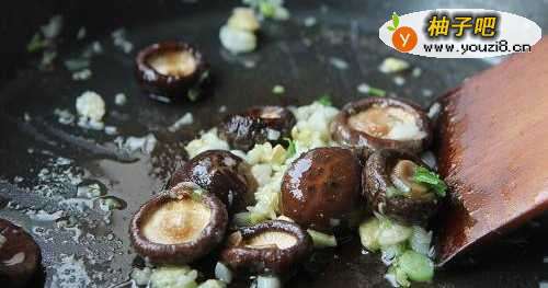 4锅内还有煎豆腐的油就不用放油了,放入姜葱蒜炒香后,放入小香菇翻炒;