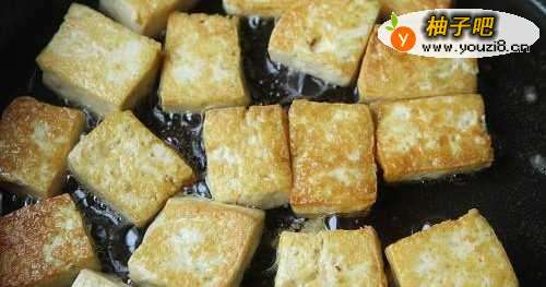2豆腐要煎到两面都起皱,这样焖的时候豆腐不容易散;