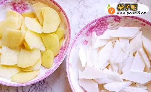3山药去皮切成片,土豆切成片