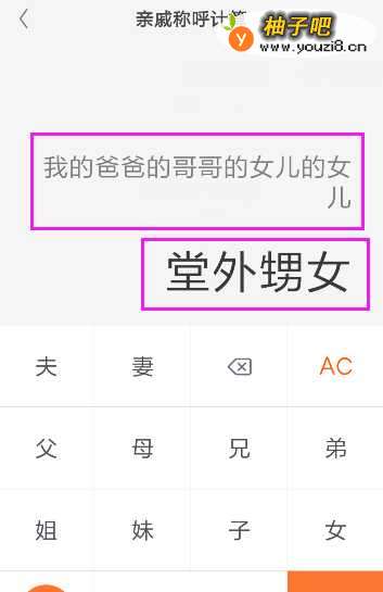 6来到亲戚称呼计算的页面,输入你要寻找的称呼,例如:我爸爸的哥哥的女儿的女儿,也可以点击互查,她称呼你什么,如图所示