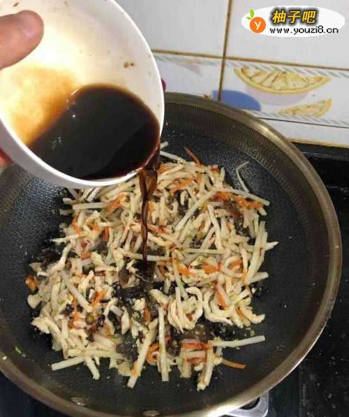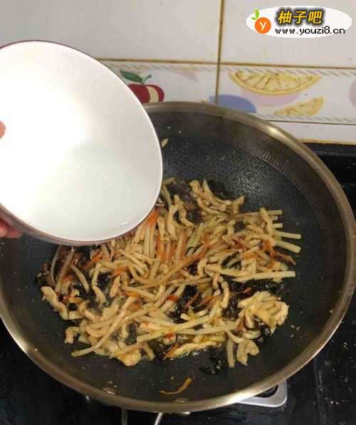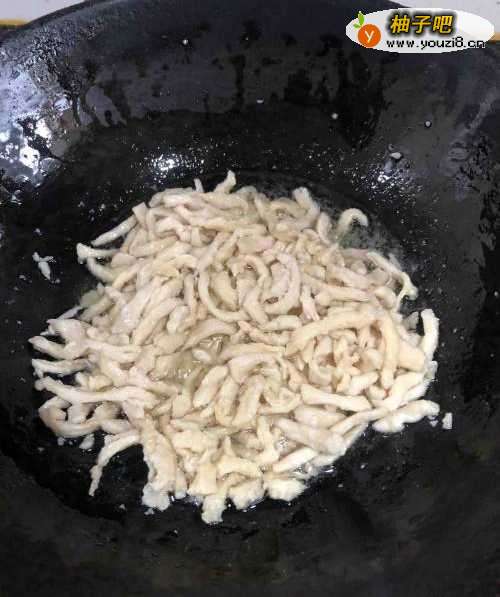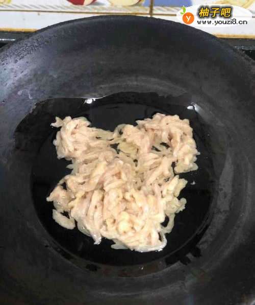 3提前将肉丝加30克料酒和适量玉米淀粉腌制20分钟,然后放入热锅凉油小火煸炒,直至熟透。