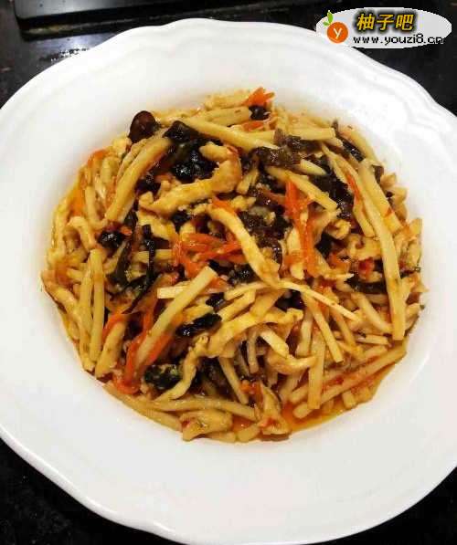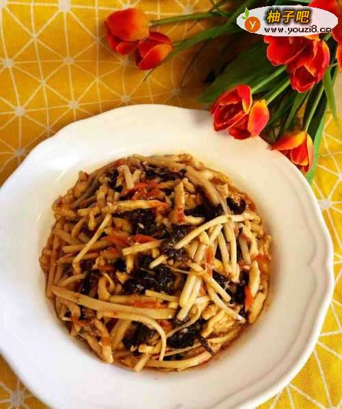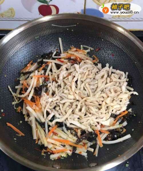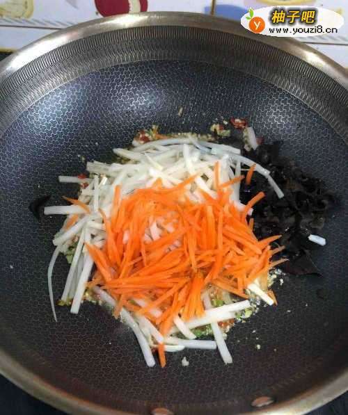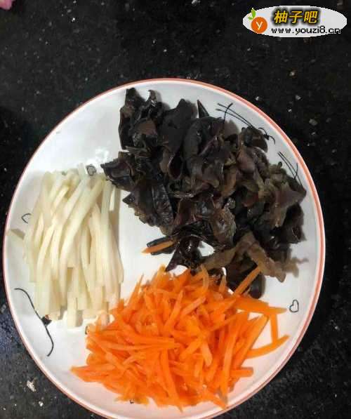 2笋丝、胡萝卜丝:木耳丝需要提前焯水备用。