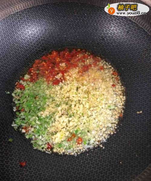 8接着依次下入姜末~葱末~蒜末煸炒至出香味,油变红。