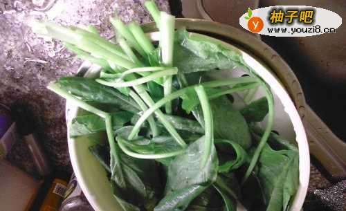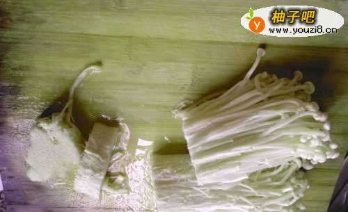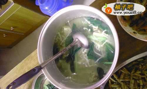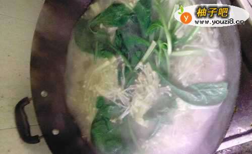 9把猪肉放进去后,接着过一两分钟把金针菇放进去,最后再过两三分钟放青菜进去,如下图所示。