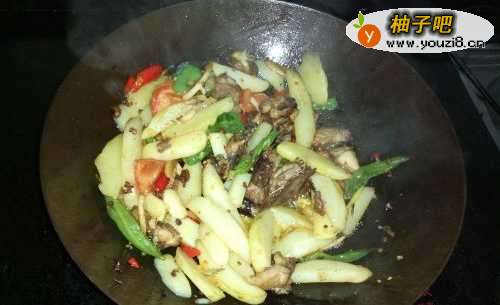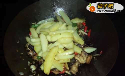 过一会儿,再把事先炸好的土豆放入锅内爆炒,紧接着加入盐,味精等辅料