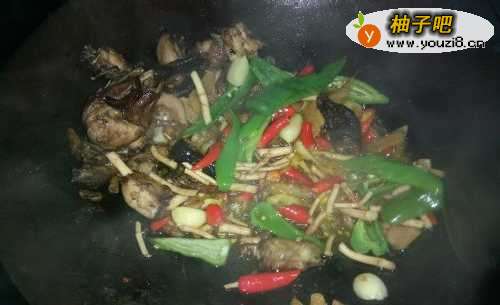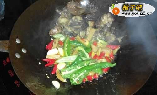 当青椒等辅料炒的差不多的时候,放入折耳根、西红柿。